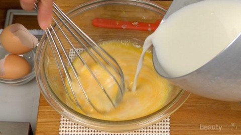 Foto: IstimewaKedua, bahan untuk puding. Pecahkan empat butir telur dalam mangkuk, kemudian kocok telur secara perlahan hingga berbusa menggunakan pengocok telur. Tambahkan susu dan gula.