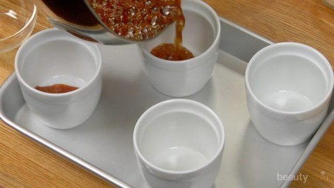 Foto: IstimewaKemudian tambahkan air panas dengan sendok sedikit demi sedikit sambil memiringkan dan memutarkan panci agar tercampur. Tuang saus caramel ke cetakan puding yang telah diolesi mentega.