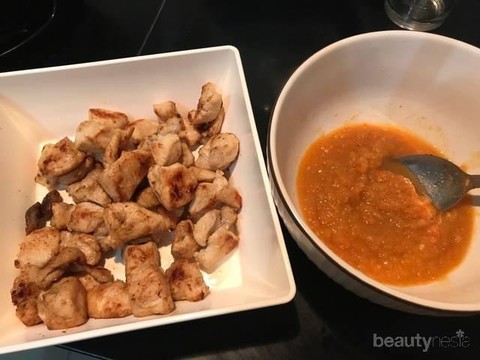 - Setelah sambal siap, goreng dada ayam yg telah dibumbu dengan api sedang