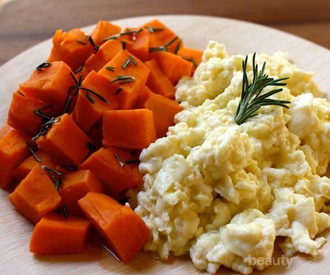 Taruh scrambled egg dan tumis kentang wortel di atas piring. Menu sahur sehat tanpa nasi pun siap untuk disantap.