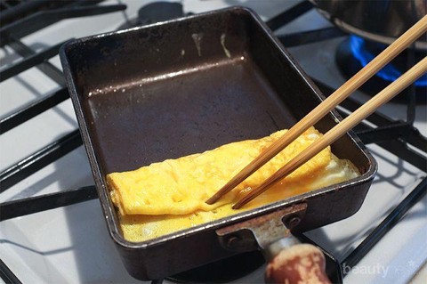 3. Menggunakan tamagoyaki pan (wajan persegi panjang), panaskan minyak dengan cara dioles tipis merata. Tuang telur dalam tiga tahap.