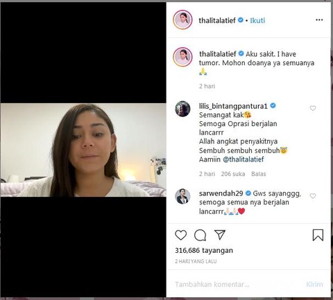 "Mpurr tetap Semangat pasti bisa dihadapi dan lewati!!! Bismillah sembuh dan pulih!!. Pasca operasi, tidak sedikit pula yang mengungkapkan rasa syukur serta memberi semangat pada Thalita. Beberapa sahabatnya seperti