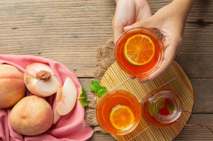 - Setelah itu, angkat dan buang buah persik kering. Tuang campuran teh ke dalam teko dan aduk dengan 4 cangkir air. Dinginkan setidaknya selama 1 jam sebelum disajikan. Sajikan di atas es dengan irisan buah persik segar, irisan lemon, dan/atau daun mint.