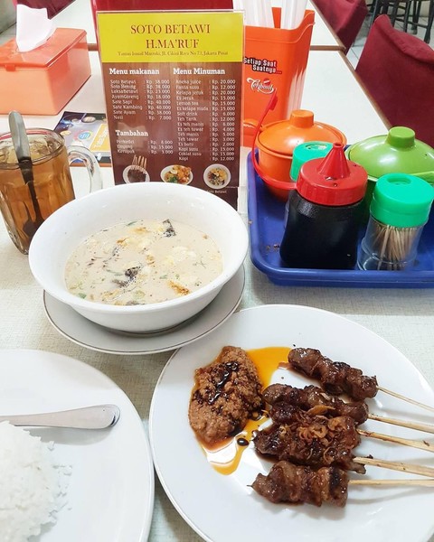 Kalau ke Jakarta, kurang afdol rasanya jika belum mencoba makanan khasnya yaitu Soto Betawi. Salah satu tempat legendaris yang menyediakan makanan ini adalah Soto Betawi Haji Ma'ruf. Berdiri sejak zaman penjajahan Belanda, tempat ini berhasil melewati tantangan-tantangan terberat seperti kekurangan bahan makanan dan diskriminasi ras pada masa itu.