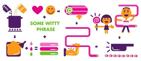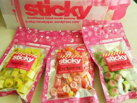 Permen di Sticky Candy merupakan permen handmade dengan kandungan 100% glukosa and bebas gluten, gula yang meleleh dengan berbagai warna kemudian ditumpuk sesuai urutan, terus digulung-gulung sampai menghasilkan rock candy motif yang lucu-lucu.https://anakjajan.com/2012/01/19/sticky-candy/ |