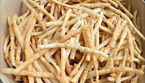 5) Langkah berikutnya adalah menggoreng adonan yang sudah dipotong di dalam minyak panas dengan api sedang. Goreng sampai berwarna kuning agak kecokelatan.