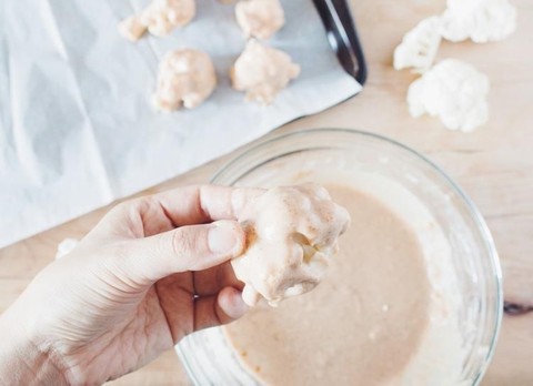 • Celupkan potongan kembang kol ke dalam adonan, pastikan adonan membalut seluruh permukaan kembang kol.