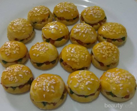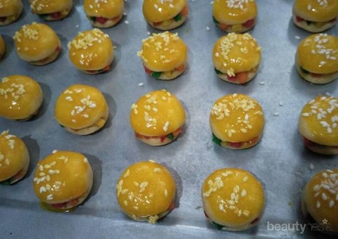 - Taburi wijen agar tampilan kue mirip dengan burger asli. Dan masukan kembali kedalam oven selama 20 menit hingga matang.