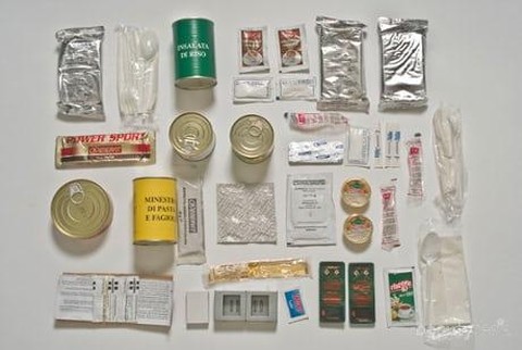 Popularitas kuliner Italia ternyata cukup tercermin dalam makanan tentara Italia. Ada satu sloki cordiale, minuman beralkohol khas Italia. Selain itu, ada cappuccino instan, banyak biscotti, dan kompor sekali pakai untuk menghangatkan makanan. Sebagai hidangan utama, disediakan pasta, sup kacang, daging kalkun kalengan, salad nasi, ditutup dengan power sport bar, salad buah kalengan atau muesli chocolate bar.