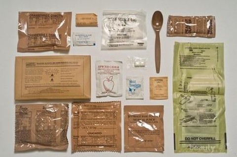 Untuk hidangan utama, tentara Amerika Serikat mendapatkan pasta dan sayuran dalam saus tomat pedas. Ada juga almond poppy seed pound cake, buah cranberry, spiced apple cider serta selai kacang dan biskuit. Bagian paling unik dari makanan tentara Amerika Serikat adalah penghangat tanpa api untuk menghangatkan makanan.