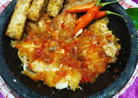 - Haluskan bumbu sambal dengan ulekan hingga halus dan beri 1 sdm minyak panas bekas menggoreng ayam