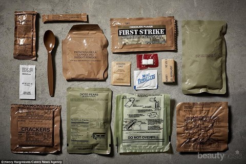 Para tentara Amerika Serikat dihidangkan ransum yang terdiri dari taco pasta, kacang, buah pir, bubuk cappuccino dan sebuah energy bar. Hanya dengan sedikit penataan visual, taco pasta jadi kelihatan mewah.